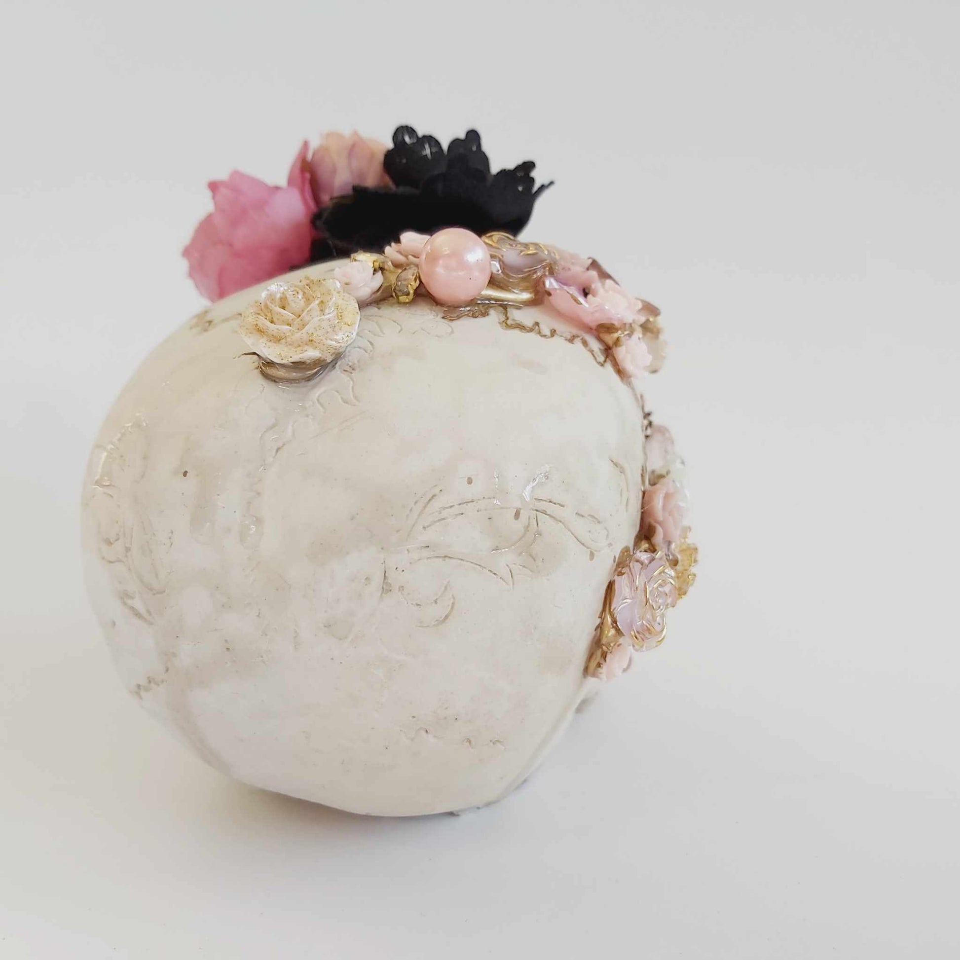 Add a touch of mystical charm to your space with this handmade decorative skull by Kaftan 9. Thoughtfully crafted, painted, and adorned with intricate floral embellishments, this piece beautifully blends gothic and vintage aesthetics with a delicate, romantic touch.