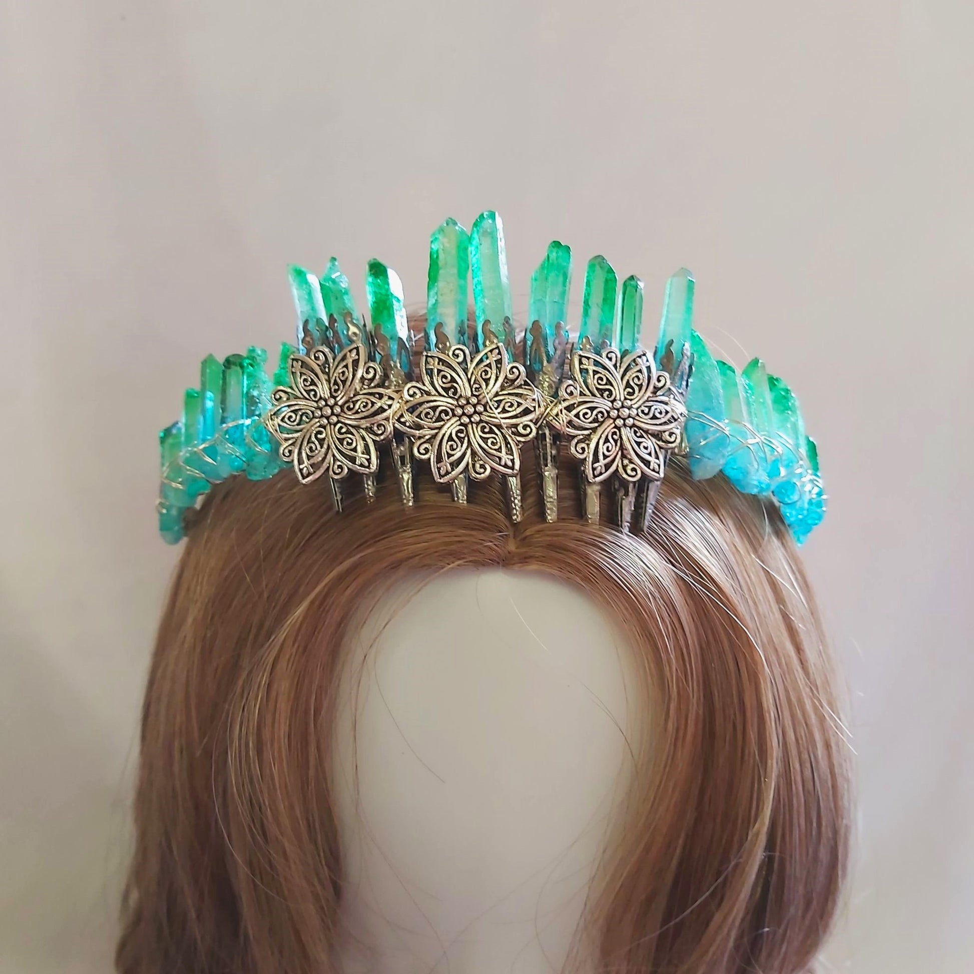 Embrace your inner goddess with this handmade crystal crown, crafted with wire and dyed Clear Quartz. Perfect for festivals, cosplay, or simply owning your power at home.