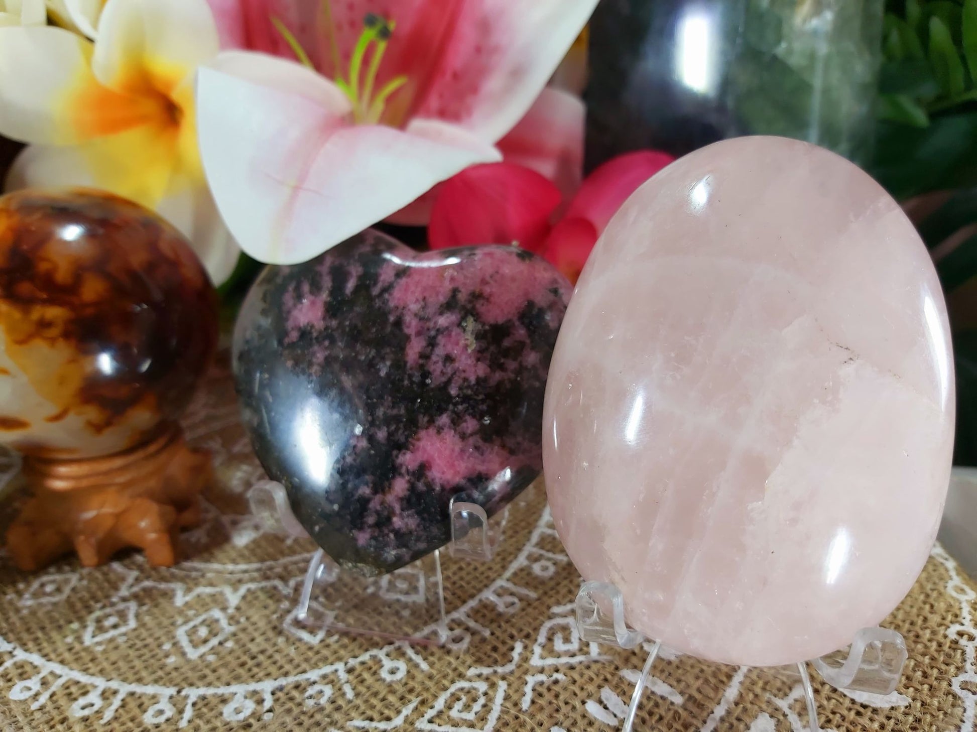 Rose Quartz (7.5 cm, 227 g): Radiates gentle feminine energy that sparks love, self-love, trust, harmony, and peaceful relationships.