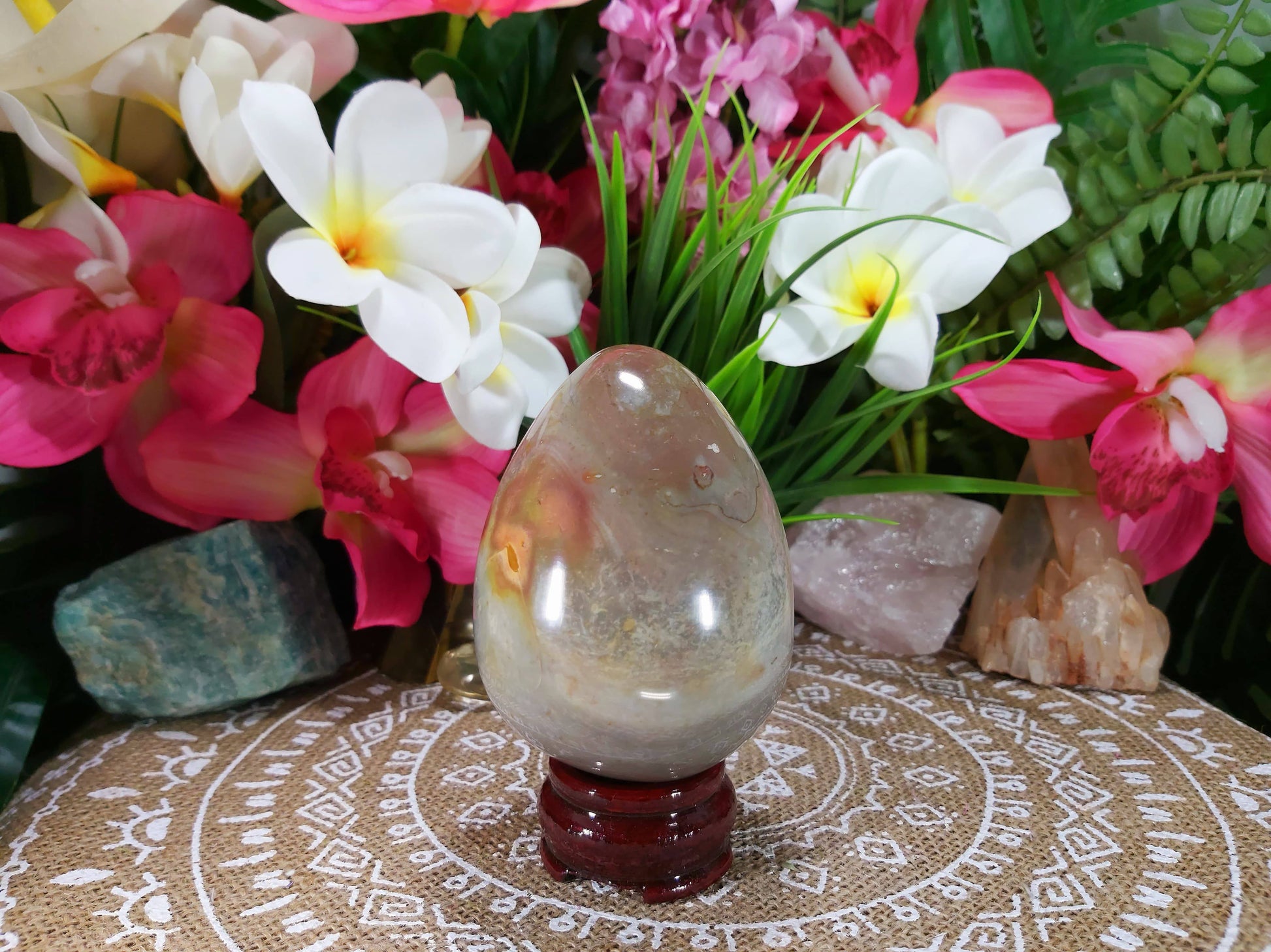 At Kaftan 9, our gemstones and crystals can be used for spiritual, mystical, and decorative purposes. Embrace this beautiful and stunning Ocean Jasper crystal into your home decor. Place this crystal on your shelf, bookcase, coffee table, desk, or inside your study, living room, or bedroom to add some colour to any surface. The spiritual properties in our crystals and gemstones help to balance one's spirit.
