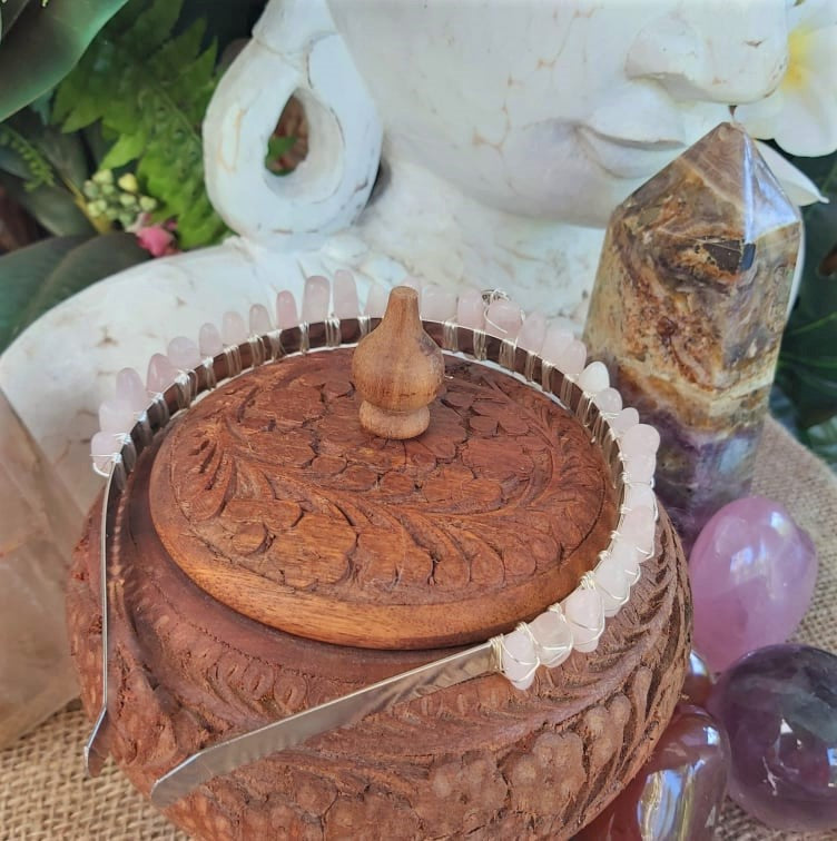 Embrace your inner goddess with this handmade crystal crown, crafted with wire and Rose Quartz. Perfect for festivals, cosplay, or simply owning your power at home.