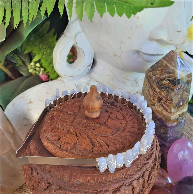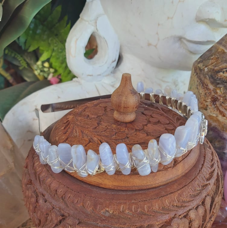 Embrace your inner goddess with this handmade crystal crown, crafted with wire and Blue Lace Agate. Perfect for festivals, cosplay, or simply owning your power at home.