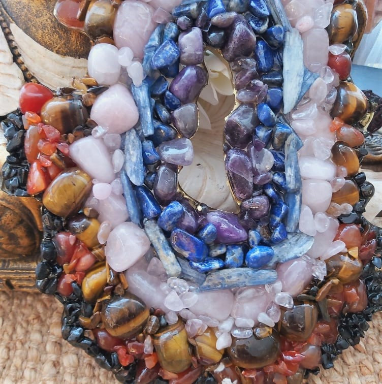 Add colour and positive energy to your space with this handmade crystal resin geode featuring Amethyst, Lapis Lazuli, Kyanite, Rose Quartz, Tiger’s Eye, Carnelian, and Black Tourmaline. Perfect for shelves, desks, or coffee tables, it brings beauty and balance to any room.