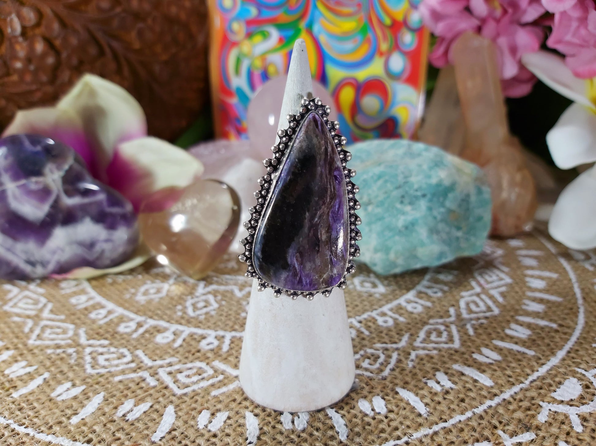 Welcome style and spirituality with this lovely, pretty, and unique Charoite gemstone ring making the perfect jewellery addition to your outfit for all occasions.