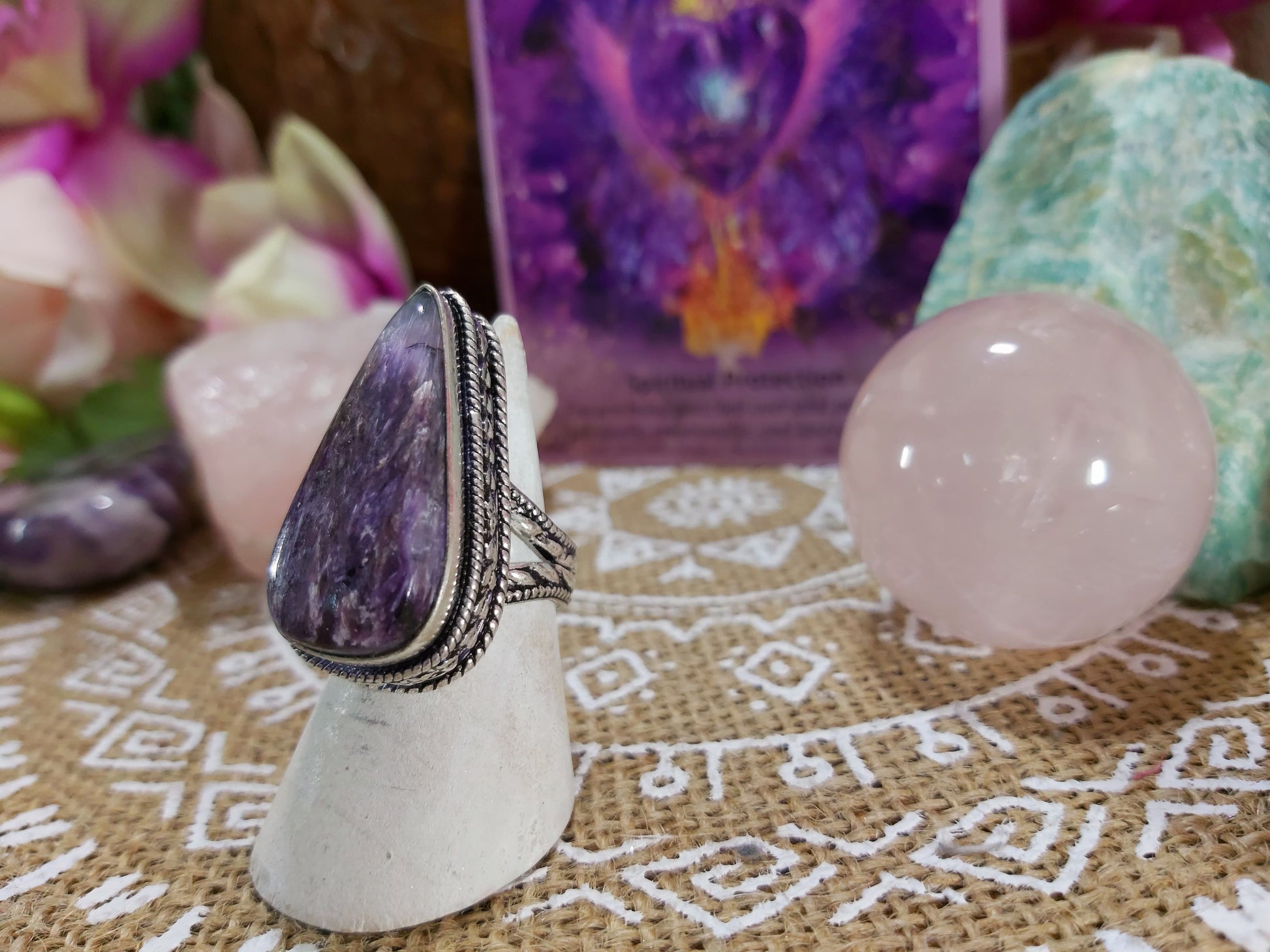 Welcome style and spirituality with this lovely, pretty, and unique Charoite gemstone ring making the perfect jewellery addition to your outfit for all occasions.