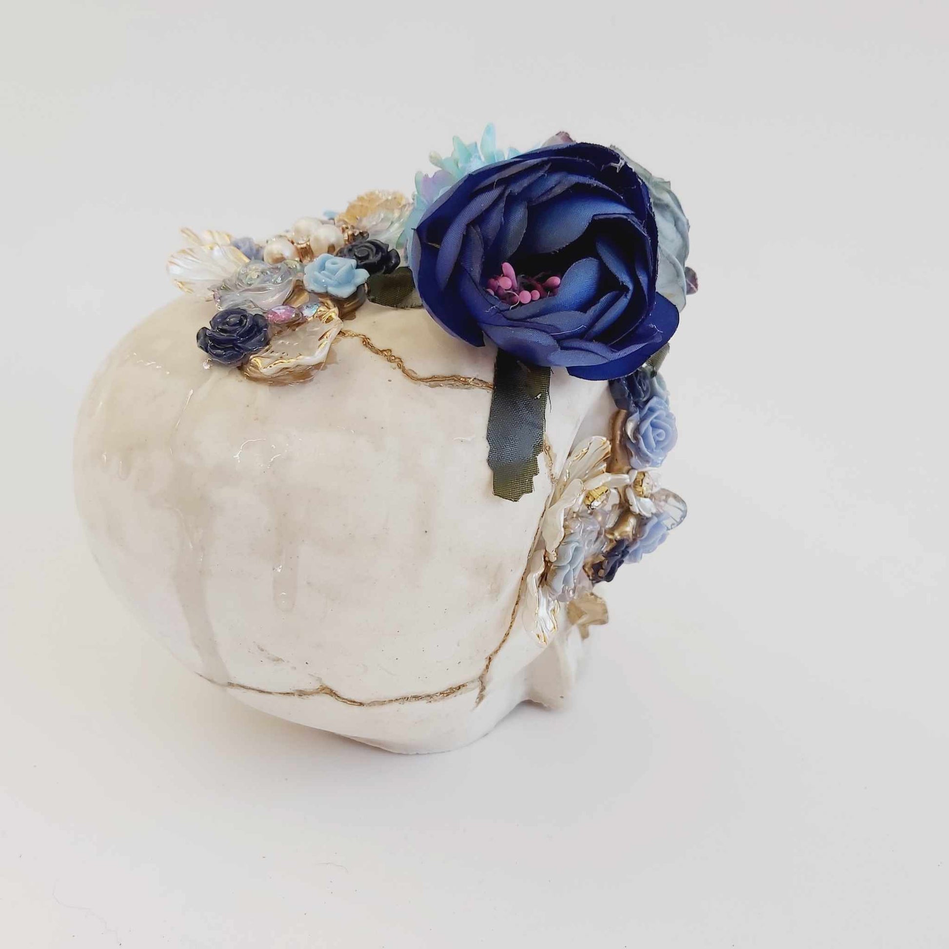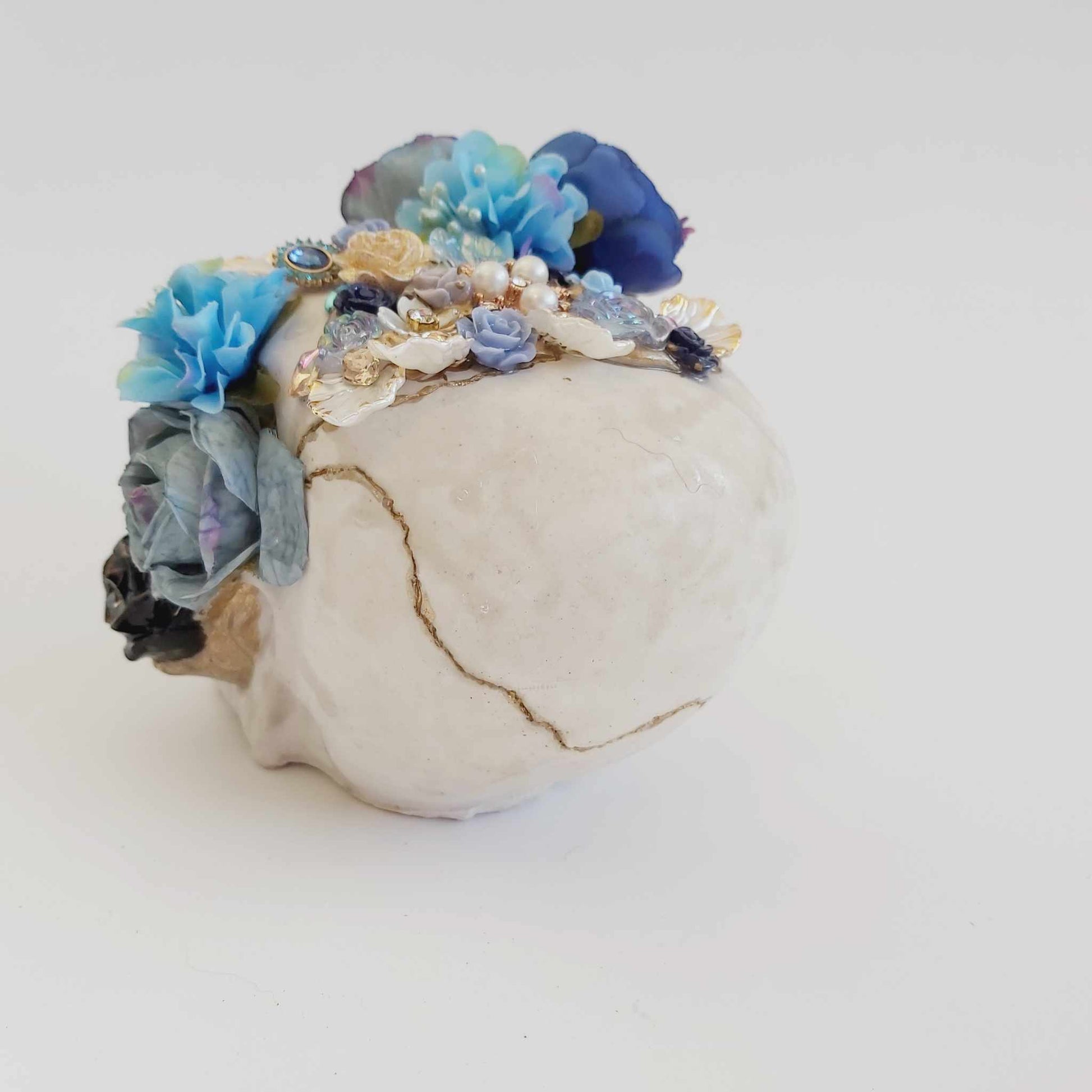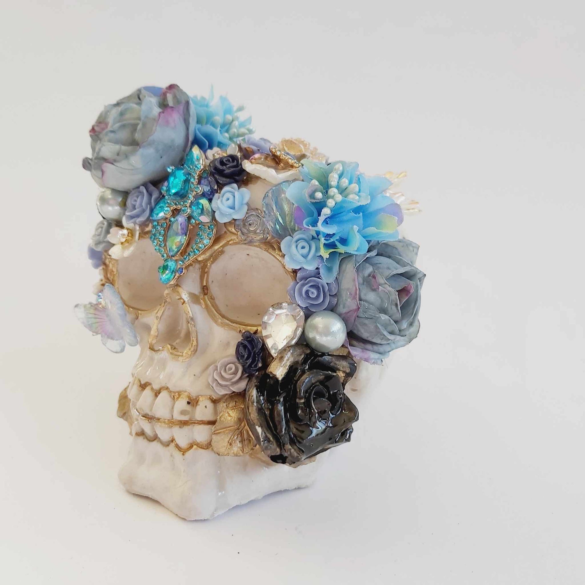 Featuring gold accents and an arrangement of flowers, pearls, and jewels, this one-of-a-kind ornament is perfect for lovers of spirituality, gothic decor, steampunk, witchy vibes, or fantasy-inspired interiors. Whether displayed as a centrepiece, altar decoration, or statement piece, it brings a unique elegance to any setting.