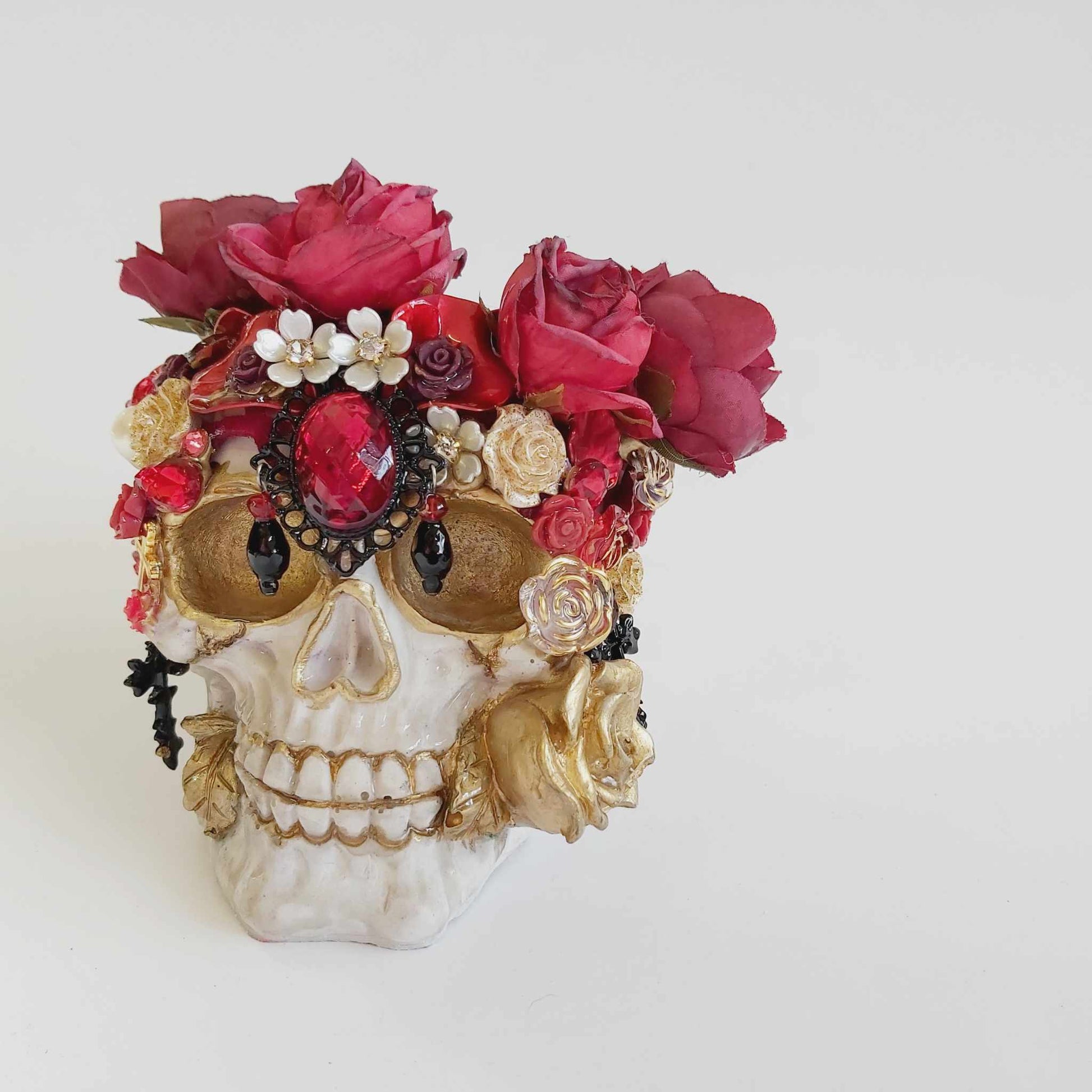 Featuring gold accents and an arrangement of flowers, pearls, and jewels, this one-of-a-kind ornament is perfect for lovers of spirituality, gothic decor, steampunk, witchy vibes, or fantasy-inspired interiors. Whether displayed as a centrepiece, altar decoration, or statement piece, it brings a unique elegance to any setting.