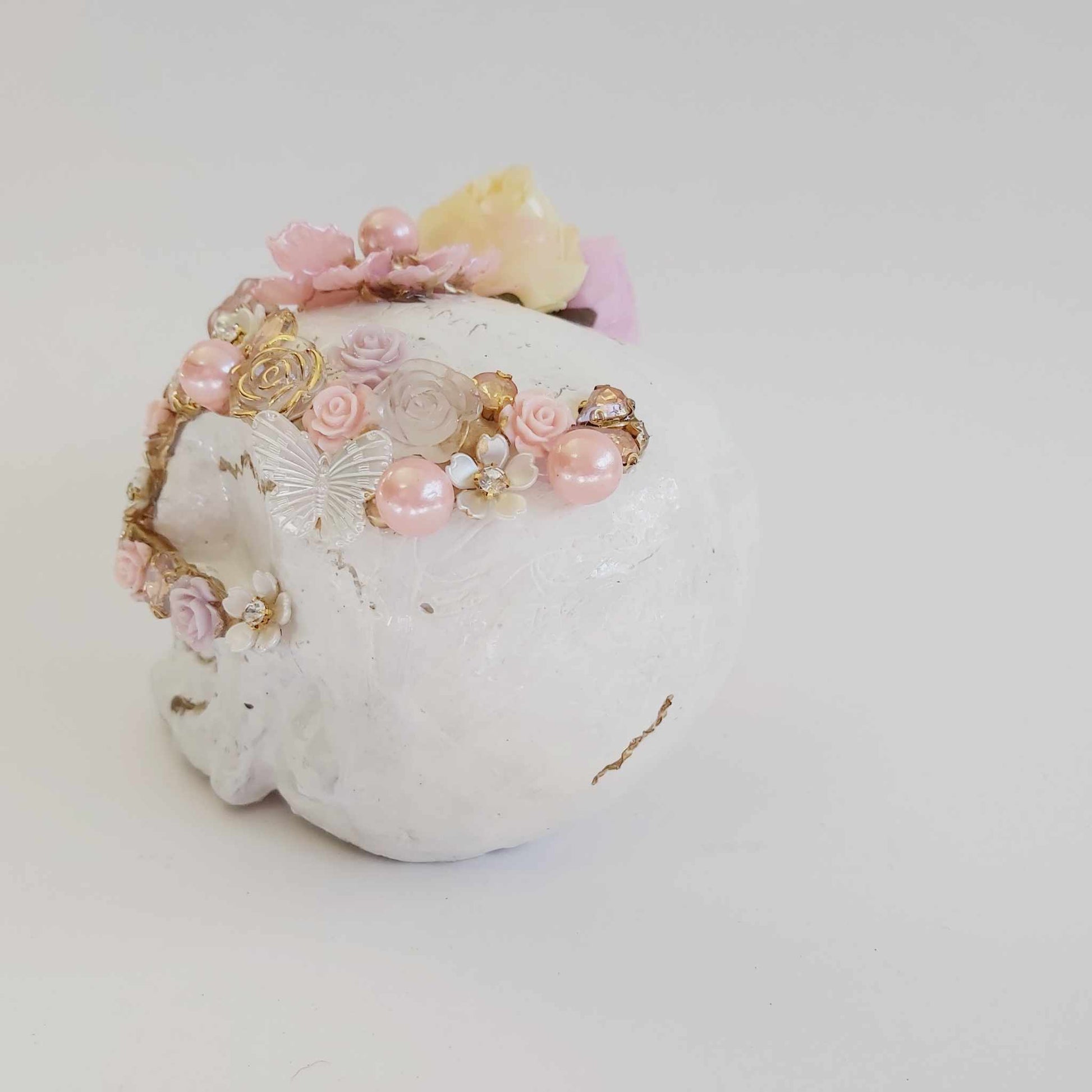 Featuring gold accents and an arrangement of flowers, pearls, and jewels, this one-of-a-kind ornament is perfect for lovers of spirituality, gothic decor, steampunk, witchy vibes, or fantasy-inspired interiors. Whether displayed as a centrepiece, altar decoration, or statement piece, it brings a unique elegance to any setting.