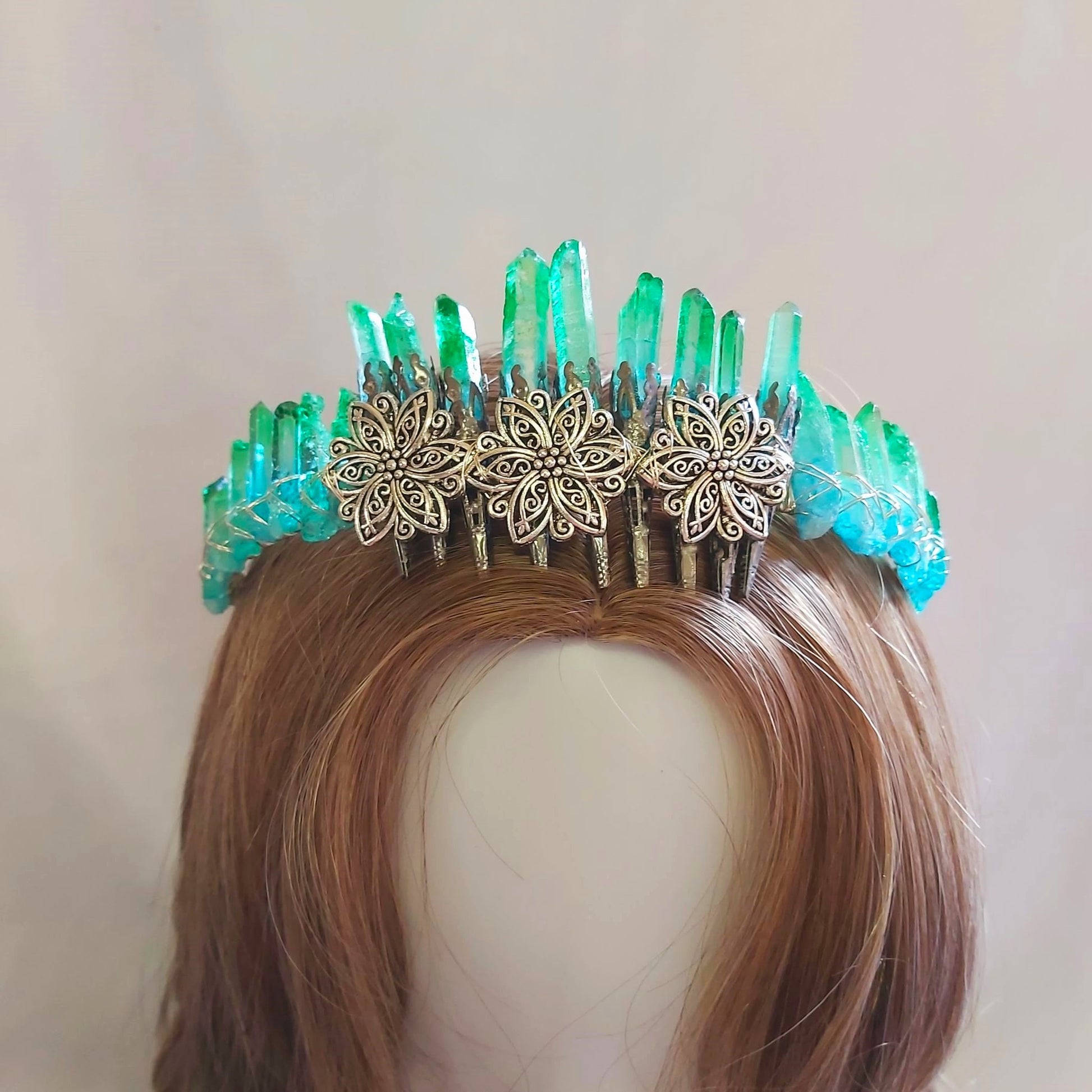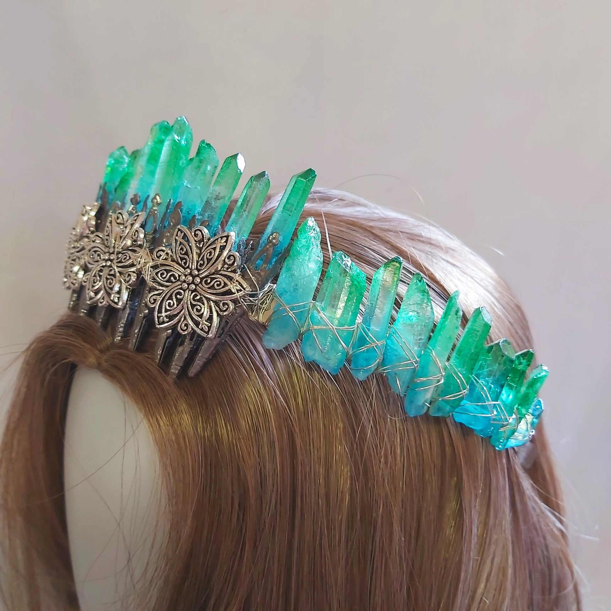 Embrace your inner goddess with this handmade crystal crown, crafted with wire and dyed Clear Quartz. Perfect for festivals, cosplay, or simply owning your power at home.