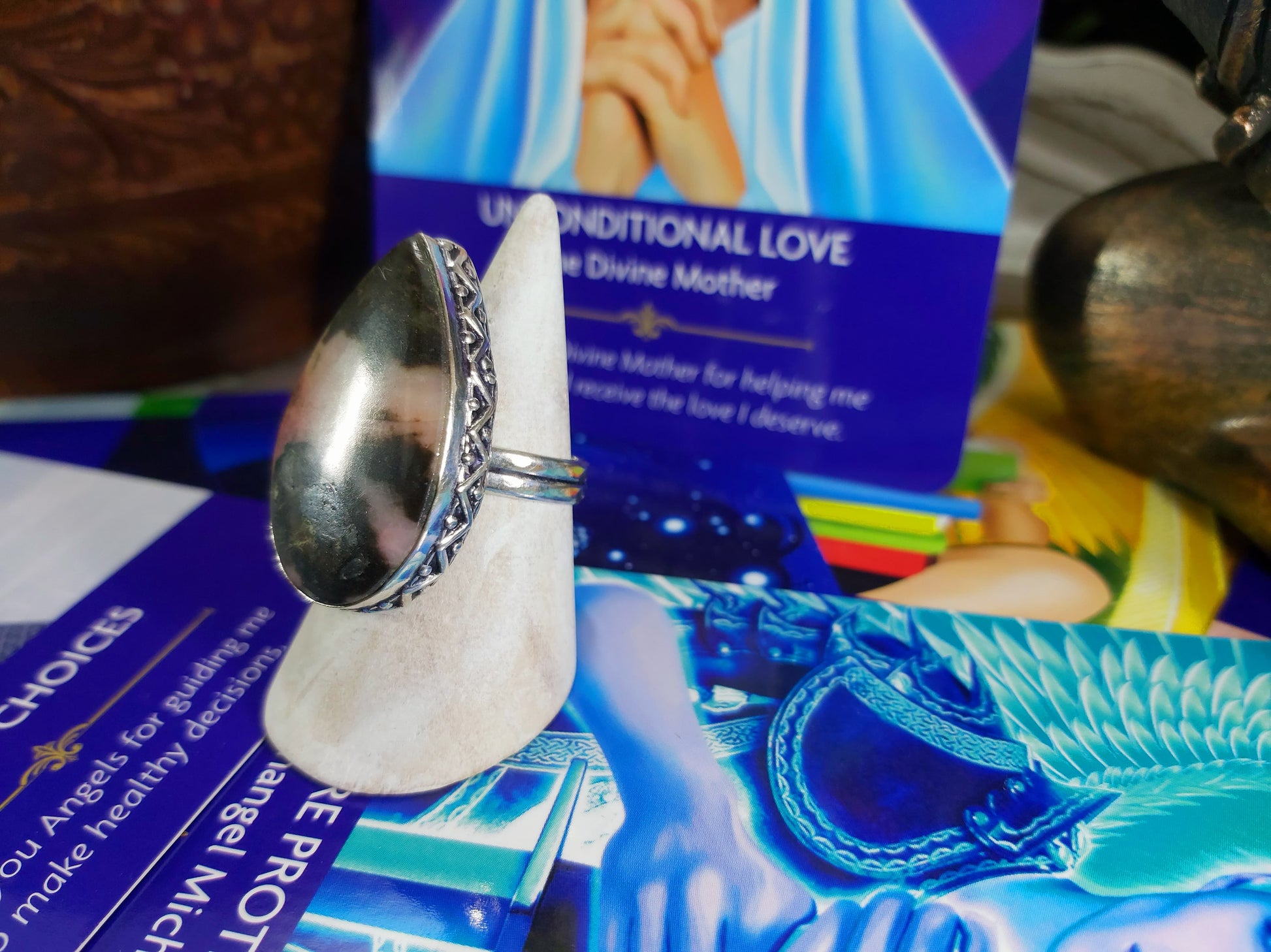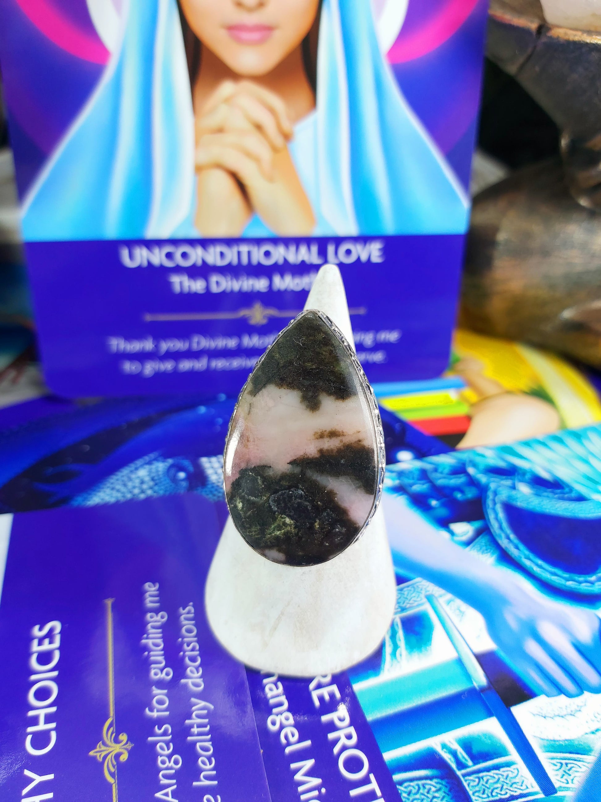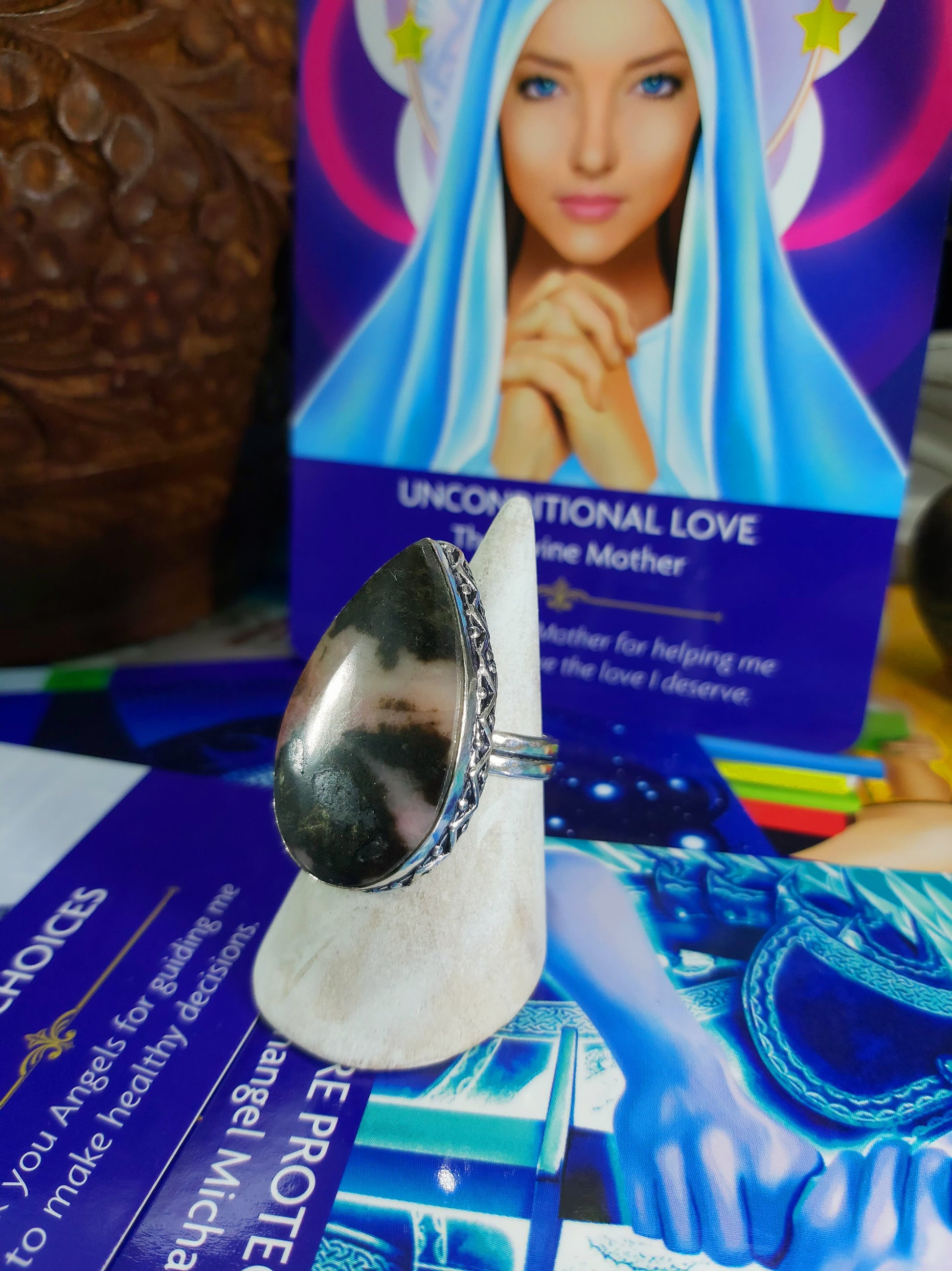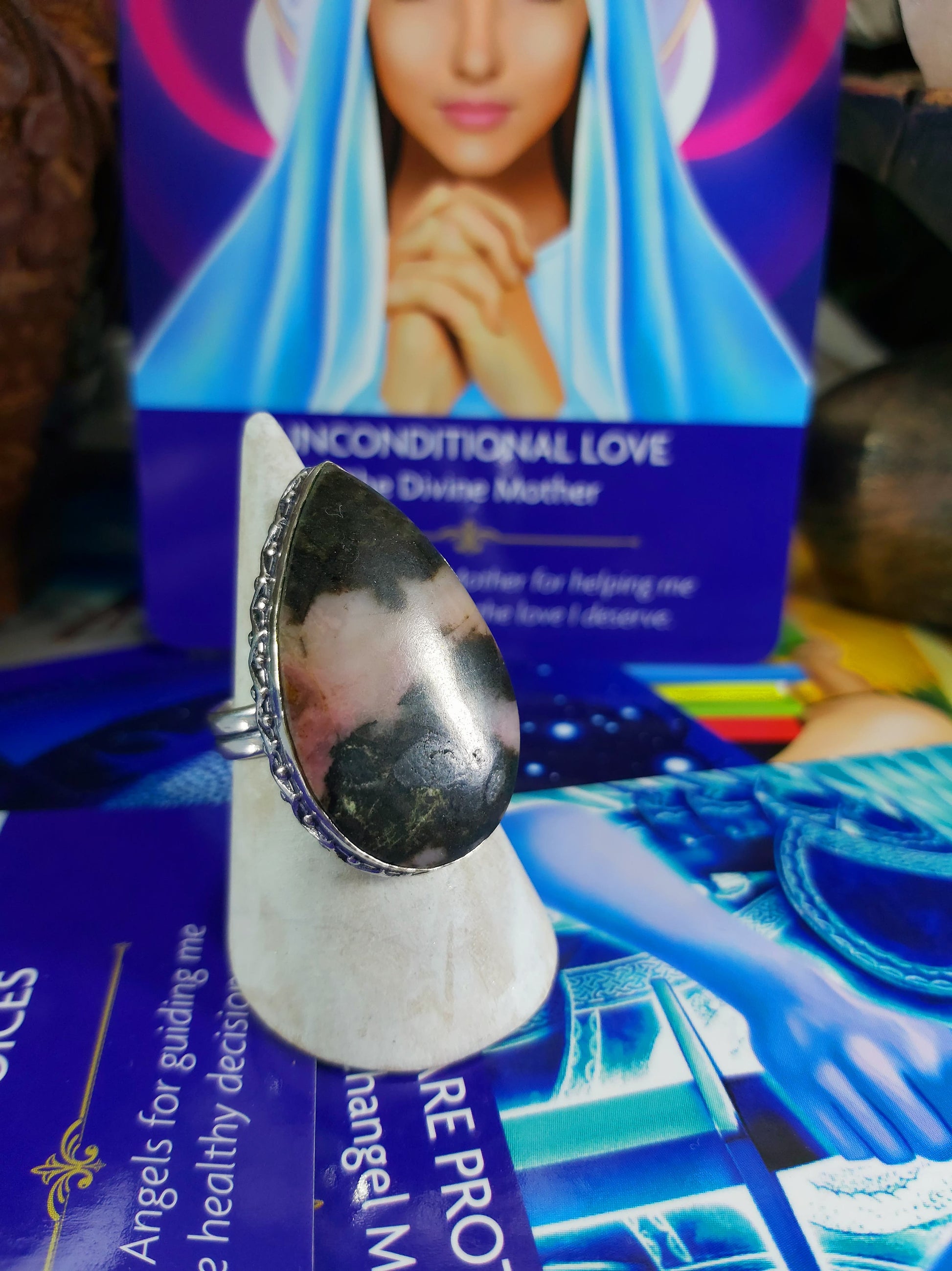 Welcome style and spirituality with this lovely, pretty, and unique Rhodonite gemstone ring making the perfect jewellery addition to your outfit for all occasions.
