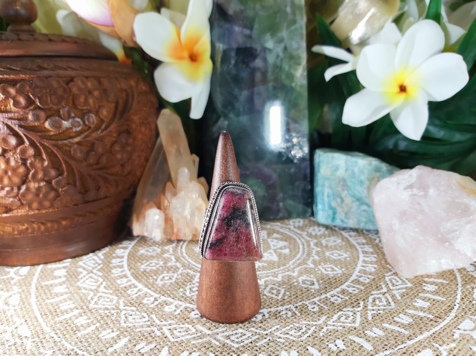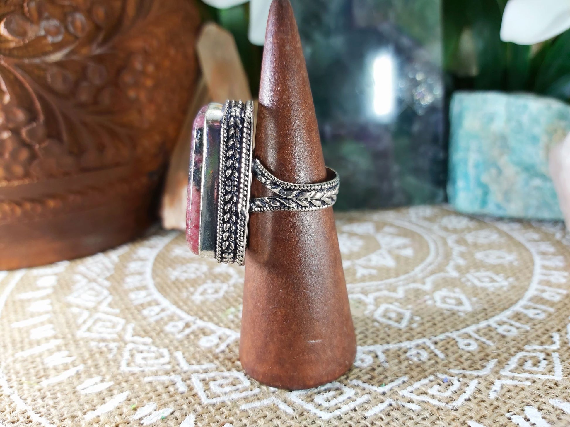 Welcome style and spirituality with this lovely, pretty, and unique Rhodonite gemstone ring making the perfect jewellery addition to your outfit for all occasions.