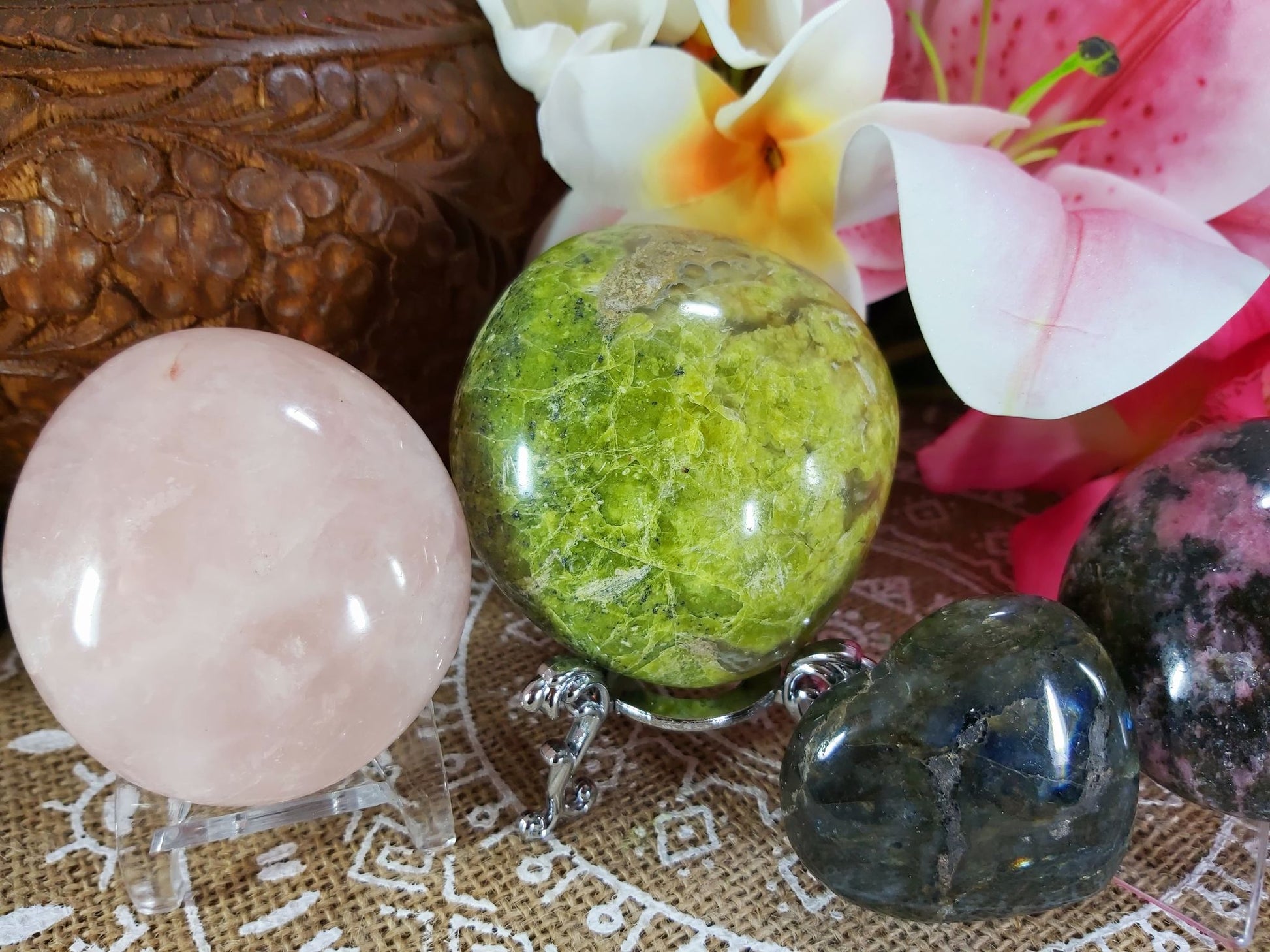4 Crystals Included: Rhodonite, Rose Quartz, Labradorite, and Green Opal