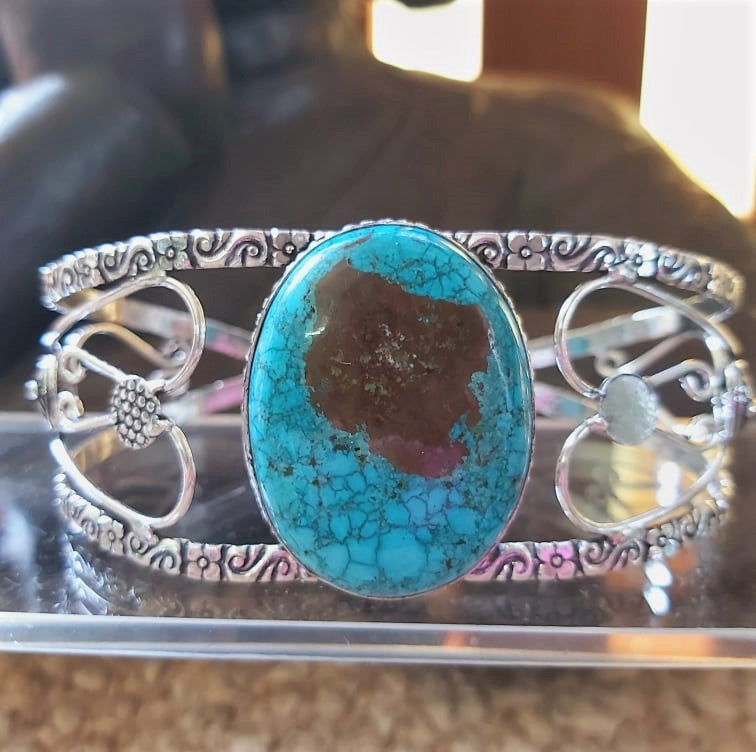 Turquoise is a copper aluminium phosphate that varies in colour from blue to blue/green due to the varying content of copper and iron.